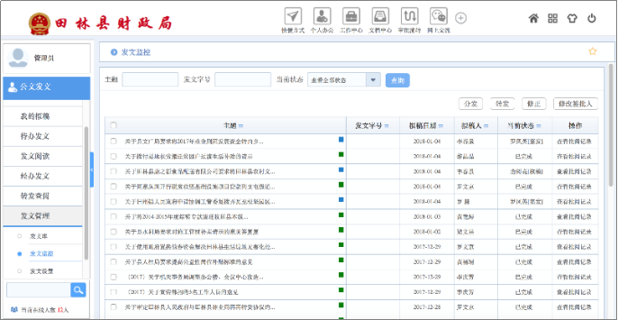 發(fā)文管理是對(duì)單位內(nèi)部發(fā)文過(guò)程的自動(dòng)化管理。擬稿人依據(jù)發(fā)文類(lèi)型選擇適合的發(fā)文模板和審批流程,送交相關(guān)領(lǐng)導(dǎo)進(jìn)行審核、復(fù)核、會(huì)簽、簽發(fā)等工作,然后由辦公室進(jìn)行發(fā)文登記、編號(hào)、紅頭文件、蓋章,并進(jìn)行文件的發(fā)放(分發(fā)、下發(fā)、辦結(jié))、打印等工作,最后由公文管理員對(duì)辦結(jié)公文進(jìn)行歸檔,在整個(gè)發(fā)文過(guò)程中,可實(shí)現(xiàn)督辦、催辦的功能。系統(tǒng)內(nèi)嵌高級(jí)office控件,支持公文正文內(nèi)容起草、修訂批注、公文正文在線直接查閱。
